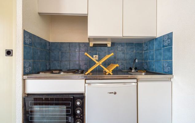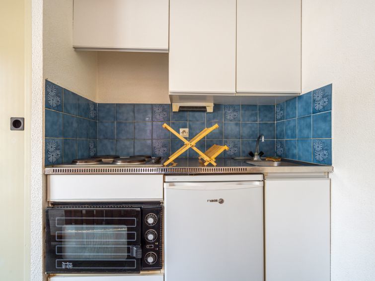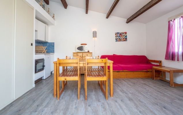 Appartement 2-kamers 35 m2, op de begane grond. Woon-/eetkamer met 1 uitschuifbaar bed (2 x 80 cm), TV (Flatscreen TV). Uitgang naar het terras. 1 kamer met 1 2-pers bed (1 x 140 cm, lengte 190 cm). Kookhoek (4-pits kookplaat, oven, magnetron, elektrische koffiemachine). Douche/WC. Terras 25 m2. Terrasmeubelen.