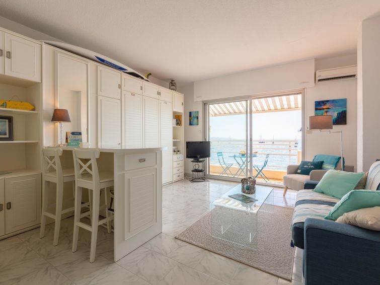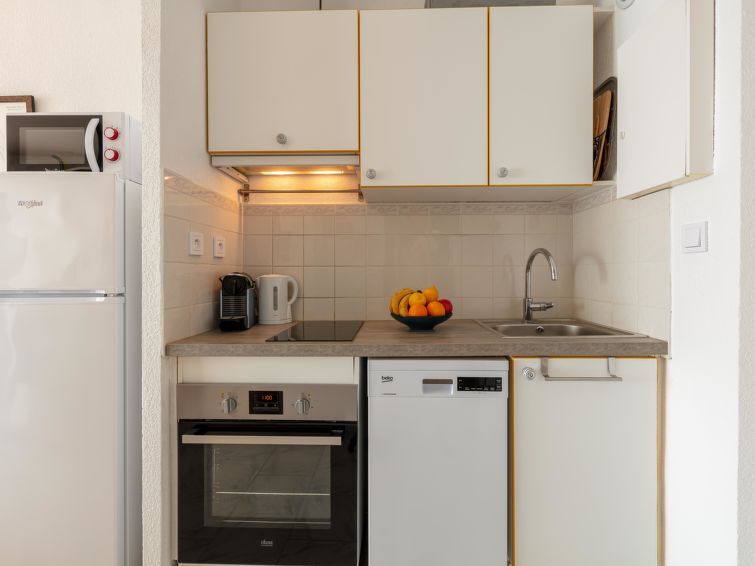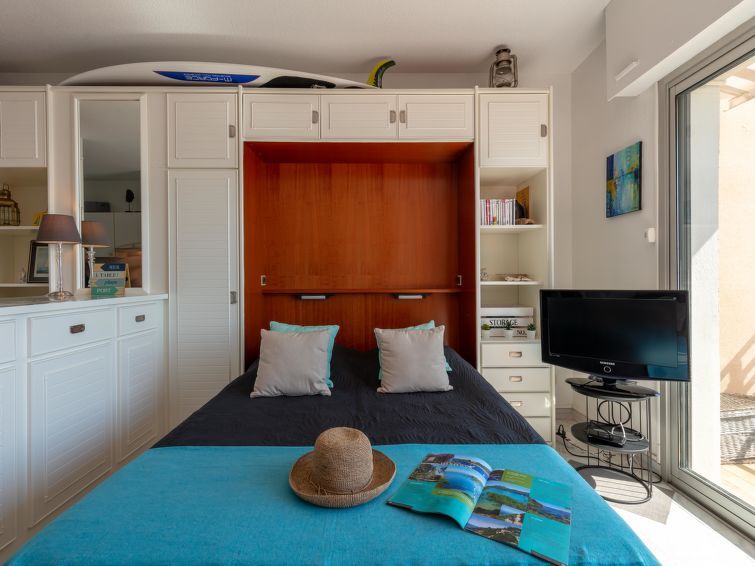 Studio 1-kamer 28 m2 op de 2e verdieping. Ruim en licht, mooi ingericht: woon-/eetkamer met 1 kastbed (140 cm, lengte 190 cm), TV en Flatscreen TV. Uitgang naar het balkon. Keuken in de hal (oven, afwasmachine, 2 keramische glas kookplaten, broodrooster, waterkoker, magnetron, diepvriezer, elektrische koffiemachine, pads voor de koffiemachine (Expresso) extra). Douche/WC. Air-conditioning. Terras 6 m2. Balkonmeubilair. Mooi uitzicht op zee. Ter beschikking: wasmachine, strijkijzer, haardroger. Internet (Internet (WiFi), gratis). Parkeerplaats (omheind). TV alleen FR. Rookmelders. Aanbod door een particulier volgens art. 155, IV van CGI.