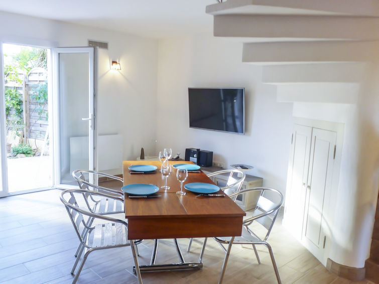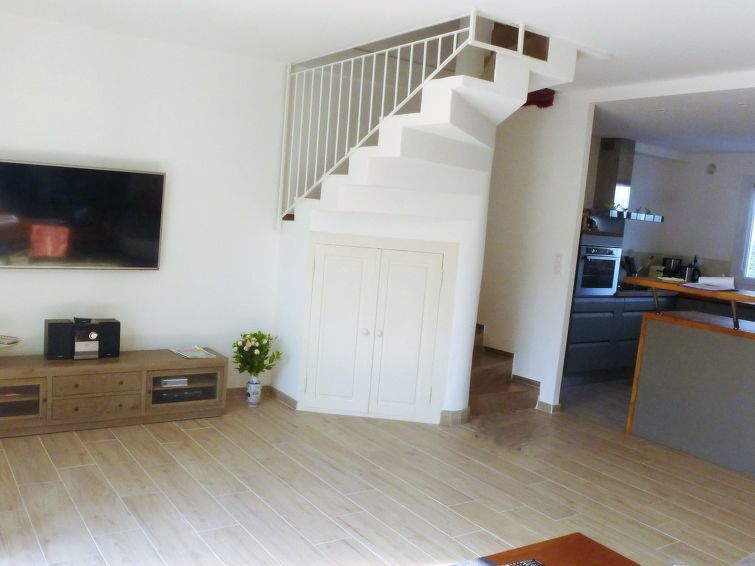 Huis in een rij 4-kamers 75 m2 op 2 verdiepingen. Licht, comfortabel en mooi ingericht: woon-/eetkamer met panoramavenster met TV (Flatscreen TV). Uitgang naar het terras. Open keuken (4-pits kookplaat, oven, afwasmachine, magnetron, elektrische koffiemachine). Aparte WC. Bovenverdieping: 1 kamer met 1 2-pers bed (140 cm, lengte 190 cm). 1 kamer met 1 uitschuifbaar bed (2 x 90 cm, lengte 190 cm). 1 kamer met 1 2-pers bed (160 cm, lengte 190 cm). Douche/WC. Terras. Terrasmeubelen. Ter beschikking: wasmachine, strijkijzer. Internet (Internet (WiFi), gratis). Parkeerplaats bij het huis. Let op: 1 klein huisdier/hond toegestaan. TV alleen FR. Rookmelders.