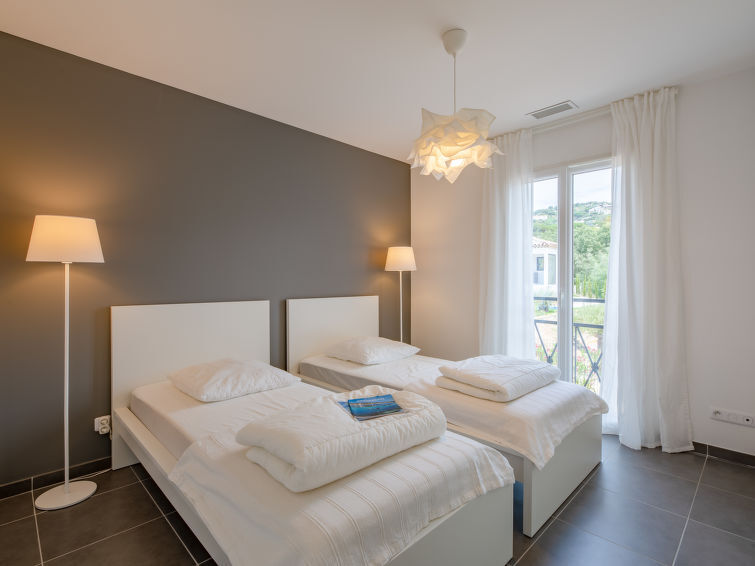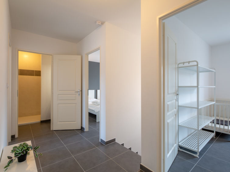 Huis in een rij 5-kamers 120 m2 op 2 verdiepingen, op het zuidwesten gelegen. Ruim en licht, comfortabel en mooi ingericht: hal met aparte WC. Groot woon-/eetkamer. Uitgang naar het terras, naar het zwembad. Groot, open keuken (oven, afwasmachine, 3 inductiekookplaten, broodrooster, waterkoker, diepvriezer, elektrische koffiemachine, combimagnetron). Bovenverdieping: 2 kamers, elke kamer heeft 1 2-pers bed (1 x 160 cm, lengte 200 cm). Uitgang naar het balkon. 2 kamers, elke kamer heeft 2 bedden (90 cm, lengte 200 cm), douche. Badkamer, aparte WC. Air-conditioning. Balkon 18 m2, terras 18 m2, overdekt. Terrasmeubelen, barbecue, ligstoelen (6). Ter beschikking: wasmachine, droger, kinderbed. Internet (Internet (WiFi), gratis). Parkeerplaats nr. F, garage bij het huis. Rookvrij huis. Rookmelders. Aanbod door een commerciële eigenaar volgens art. 155, IV, CGI 83107000658FI