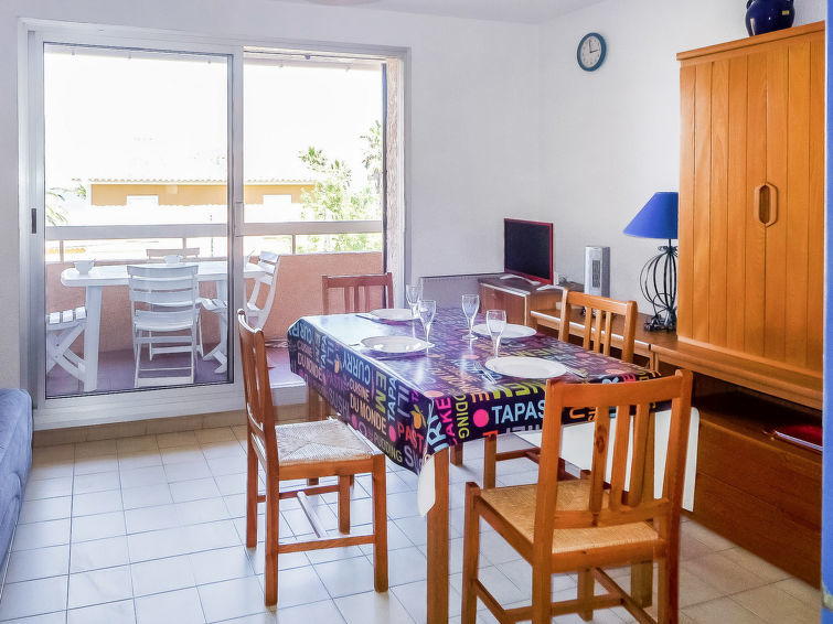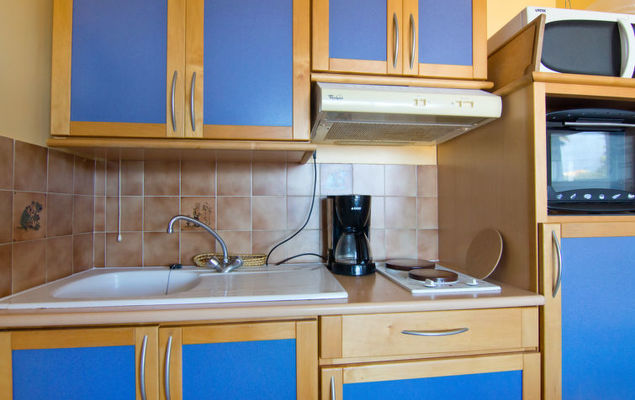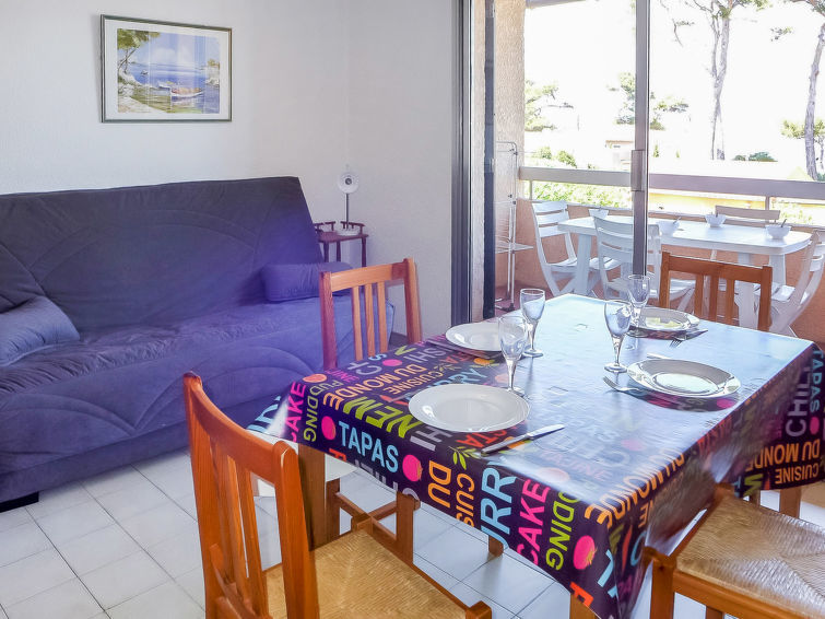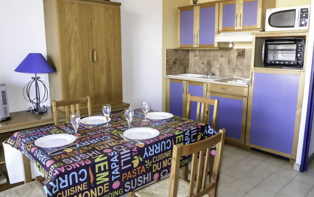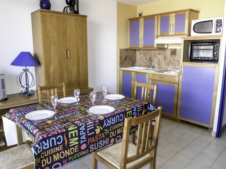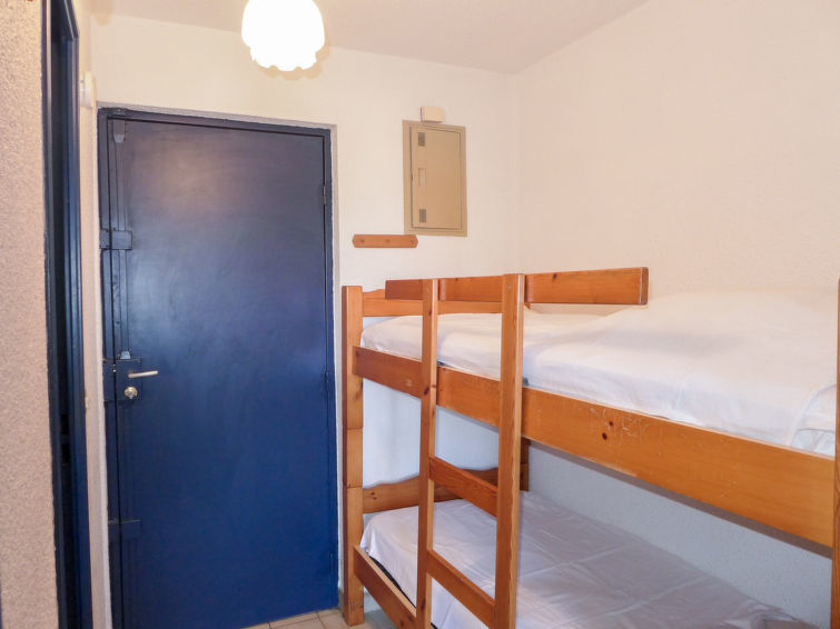 Studio 1-kamer 22 m2 op de 1e verdieping. Eenvoudig ingericht: woon-/eetkamer met panoramavenster met 1 2-pers divanbed (1 x 130 cm, lengte 190 cm), TV en ventilator. Uitgang naar het terras. Hal met 1 x 2 stapelbedden (80 cm, lengte 190 cm), ventilator. Kookhoek (oven, 2 keramische glas kookplaten, magnetron, elektrische koffiemachine, pads voor de koffiemachine (TASSIMO) extra). Douche/WC. Elektrische verwarming. Terras 7 m2. Terrasmeubelen. Uitzicht in de verte op zee. Ter beschikking: Internet (Internet (WiFi), extra). Parkeerplaats nr. 205 (omheind). Let op: niet geschikt voor kleine kinderen. TV alleen FR. Rookmelders.