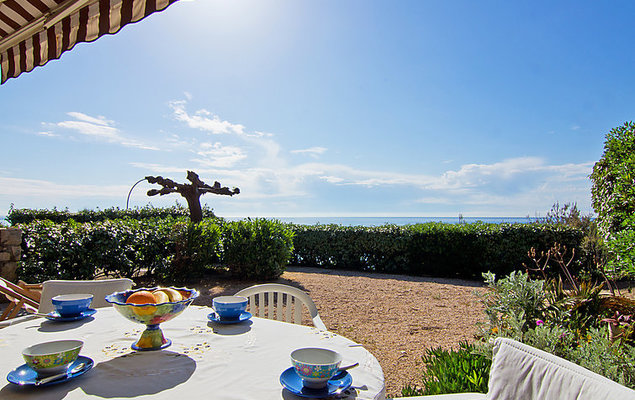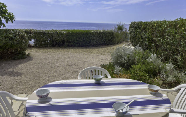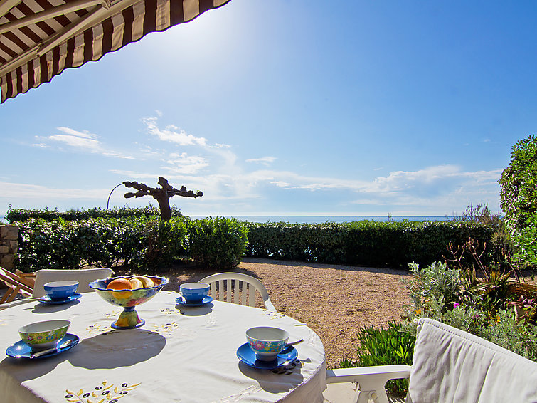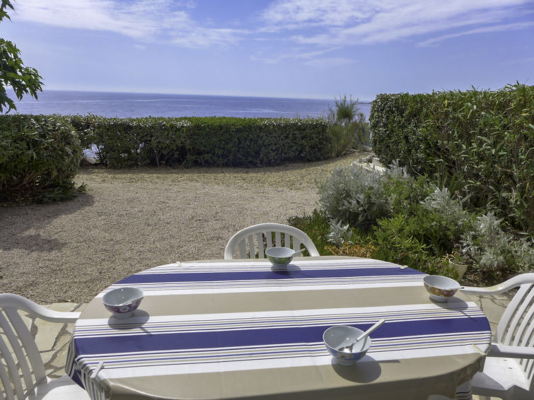 Appartement 3-kamers 50 m2, op de begane grond. Comfortabel en mooi ingericht: woon-/eetkamer met panoramavenster met TV en ventilator. Uitgang naar het terras. 1 kamer met panoramavenster met 2 bedden (90 cm, lengte 190 cm), ventilator. Uitgang naar het terras. 1 kleine kamer met 1 2-pers divanbed (1 x 125 cm, lengte 190 cm). Keuken (oven, afwasmachine, 4 inductiekookplaten, waterkoker, magnetron, diepvriezer, elektrische koffiemachine). Uitgang naar het terras. Badkamer, aparte WC. Groot terras, zithoek in de tuin 150 m2. Terrasmeubelen. Uitzicht op zee. Ter beschikking: wasmachine, strijkijzer, haardroger. Internet (Internet (WiFi), gratis). Parkeerplaats nr. 19. Let op: TV alleen FR. Rookmelders.